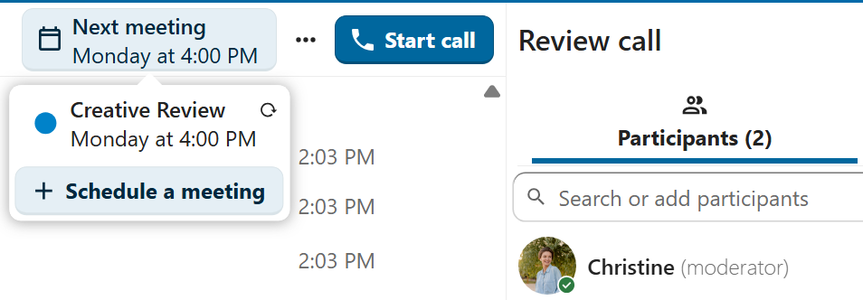 It is possible to schedule a meeting directly from a conversation. In the dialog, you can set meeting details such as title, date, time and description. You can also choose to invite all participants including email guests, or select specific ones.