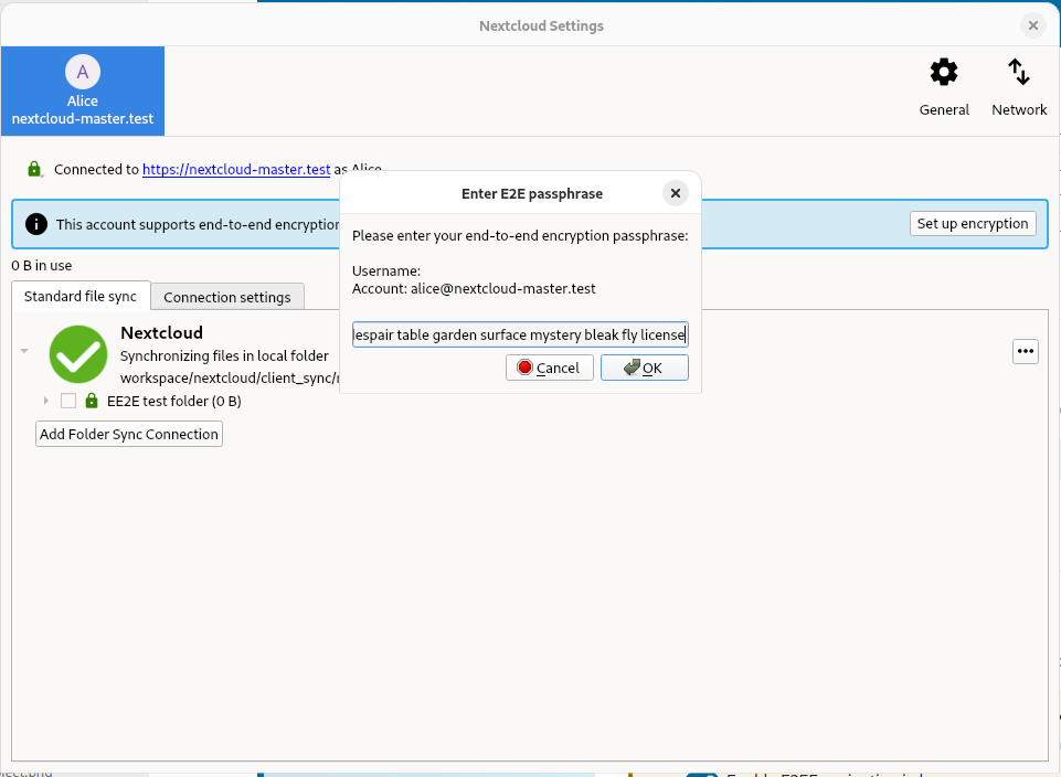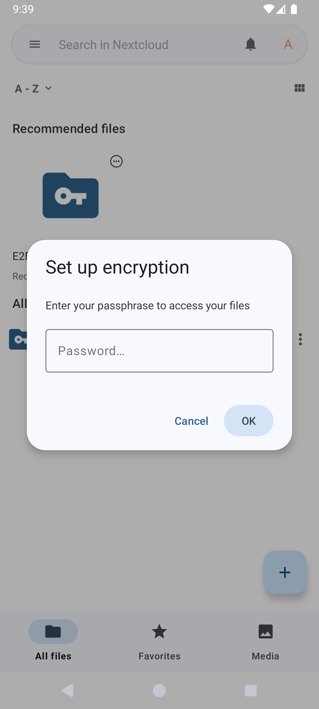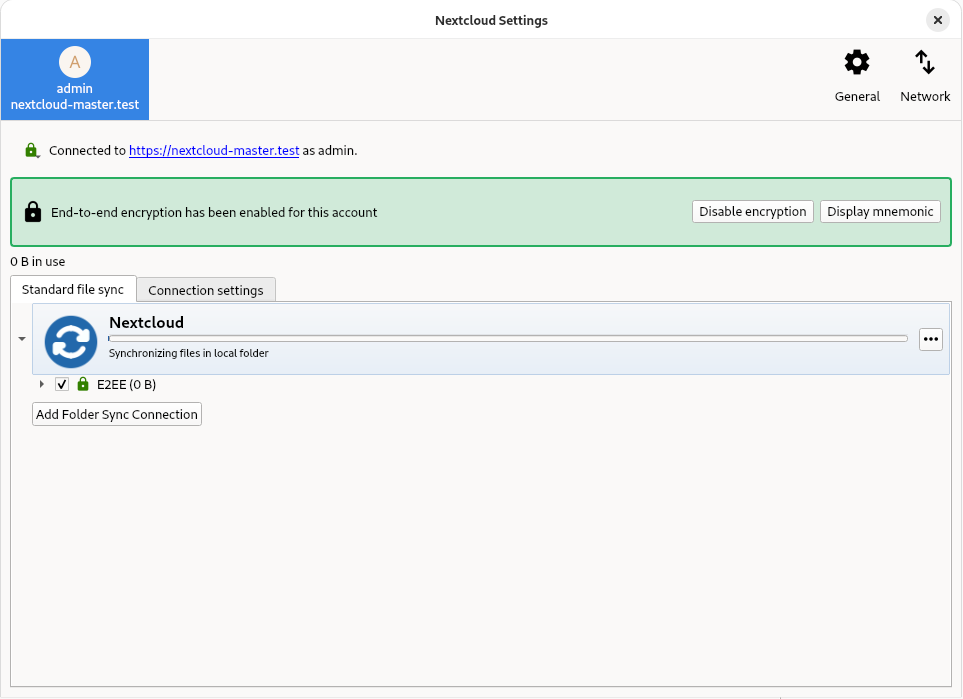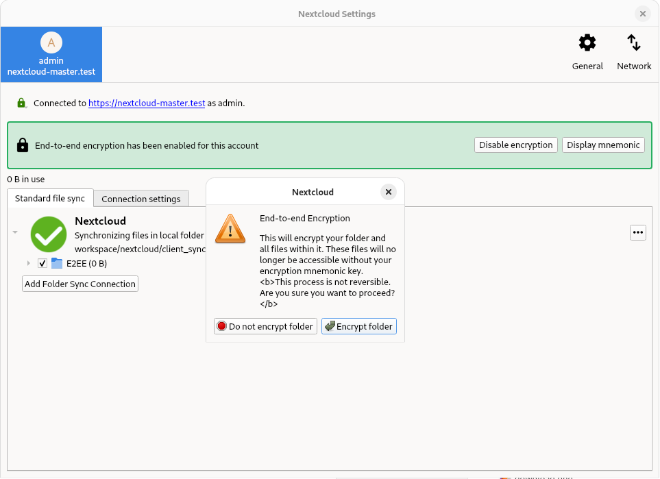 If enabled server side, Nextcloud provides the possibility to encrypt your files on your devices. This is called end-to-end encryption, or E2EE, because the files are encrypted on your device and only decrypted on your device. The server never sees the unencrypted files, further protecting user privacy and data security.