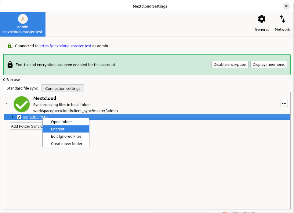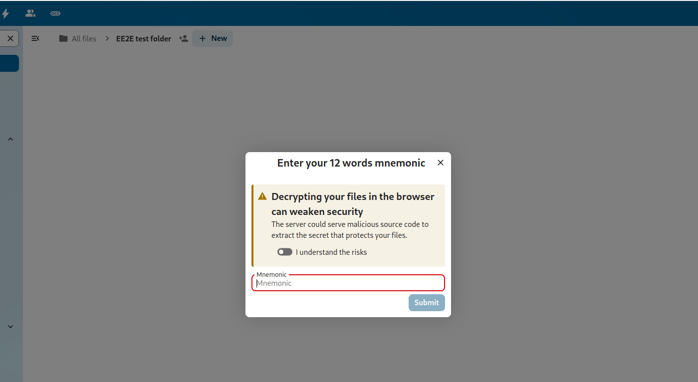 In the browser, first enable E2EE in the personal settings. This is needed, as E2EE is less secure in the browser, requiring you to fully trust the administrator to not alter the source code the browser will execute. E2EE folders are currently read-only. Therefore, it is not possible to add, remove, edit, or share an E2EE file from the browser.