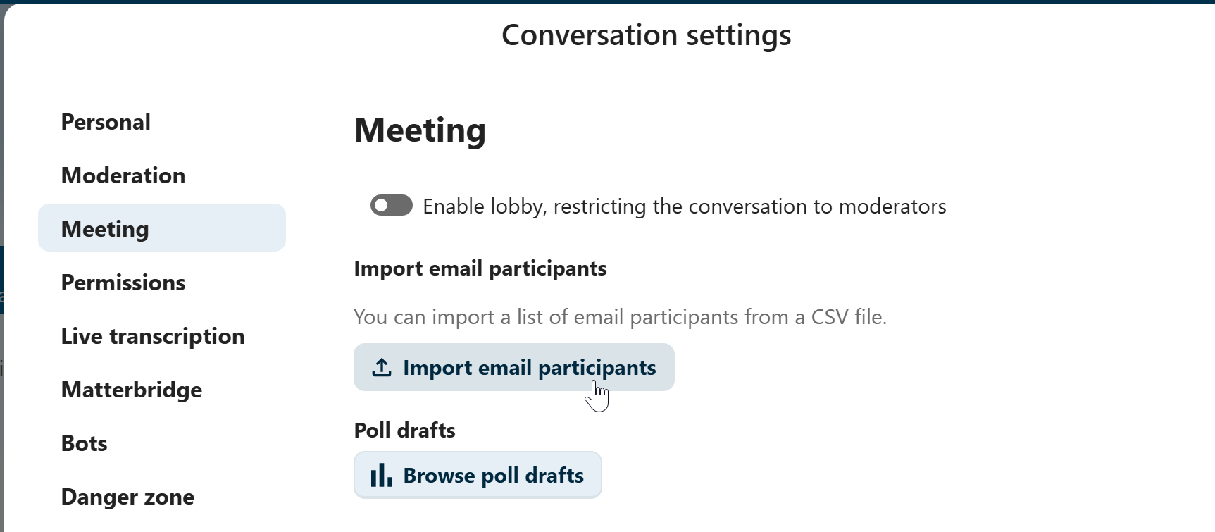 You can bulk invite email participants by uploading a CSV file. The option is available in the conversation settings under Meeting section.