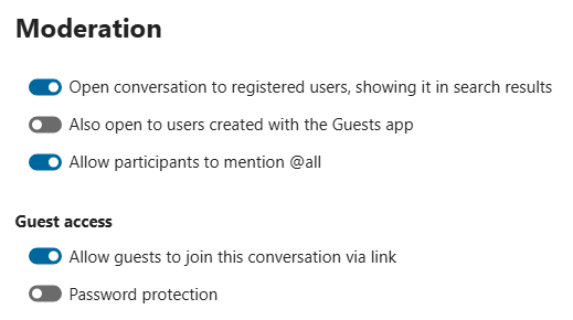 Moderators can configure the conversation. Select Conversation settings from the ... menu of the conversation on the top to access the settings.