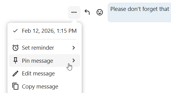 Pinned messages are highlighted and accessible above the chat or in the Shared items tab of the content sidebar. If you no longer need a pinned message, you can unpin it for everyone or only yourself from quick actions.