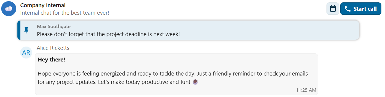 When you’re in a conversation, you can start a call any time with the Start call button. Other participants will get notified and can join the call.