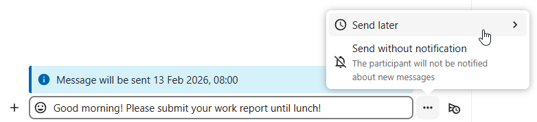 If you want to send a message not right now, but at a specific time, you can schedule it. Just select the desired date and time in the quick actions next to the input field.
